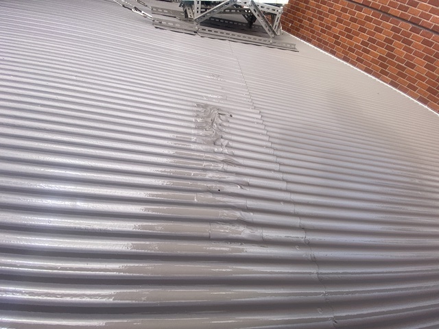 屋根を見ると大きな異常はないですが、折板屋根の屋根材のつなぎ目が足で踏むと