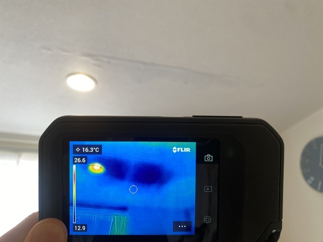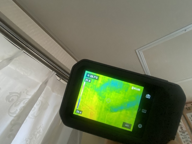 赤外線画像で見ると上部の外壁から雨漏りしているのがわかります。