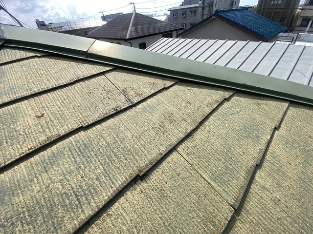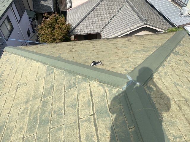 スレート屋根は棟部分から(高井場所)重なて貼っていますので