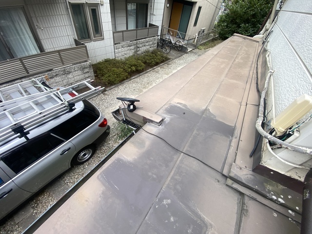 勾配が緩く、この屋根は塗装時に縁切りがされてなく、屋根材と屋根材との間が
